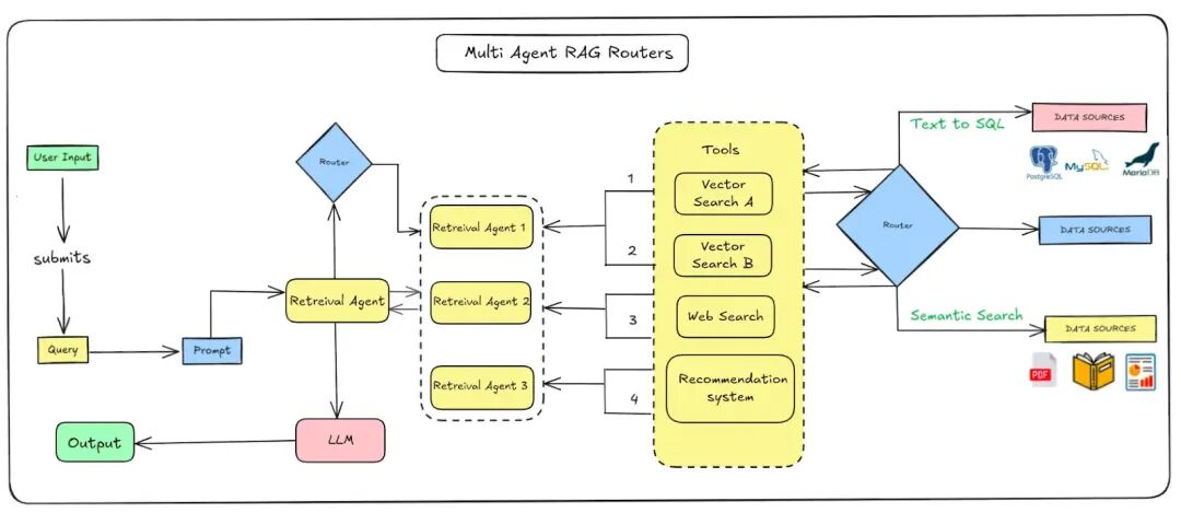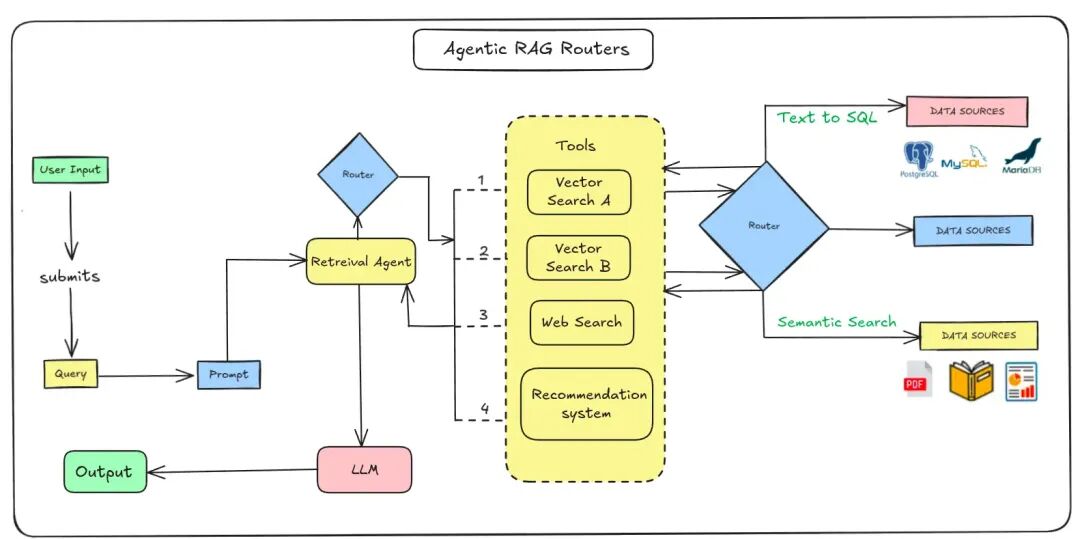 类似地,Agentic RAG 路由器是设计用来动态地将用户查询路由到合适的工具或数据源,从而增强 LLM 能力的系统。此类路由器的主要目的是将检索机制与 LLM 的生成能力相结合,以提供准确且具有上下文的响应。