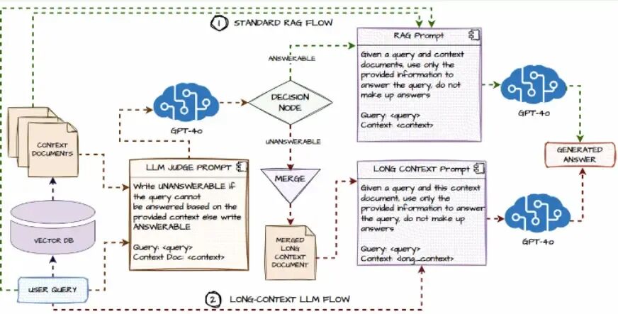 • 长上下文 LLM 流程:处理需要扩展或合并上下文的复杂查询。