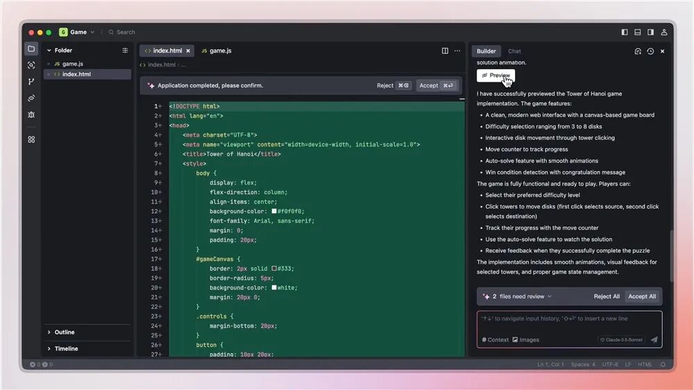 项目快速构建:在 Builder 模式下,开发者只需告知 AI 想要创建的应用类型,它会自动完成从项目搭建的各项任务,包括分解任务、创建或修改文件、生成和运行命令等,让开发者能快速从无到有创建项目。