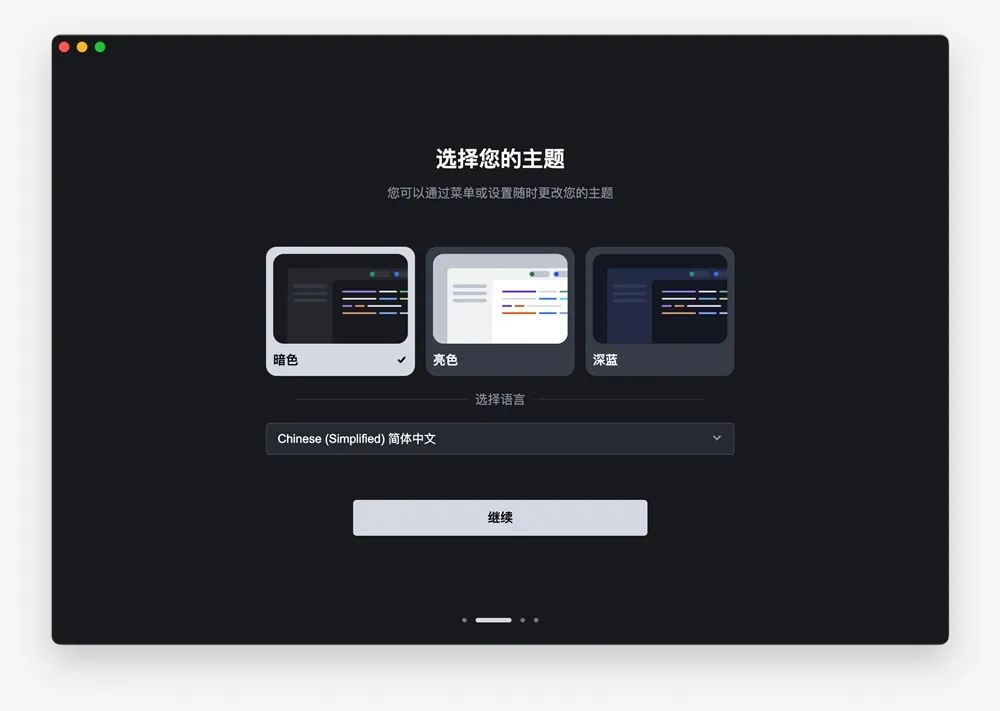 安装完成后,点击 Trae 图标启动程序,首次启动会进入设置界面。在此界面中,选择 Dark、Light 或 DeepBlue 主题,并从 English 或简体中文中选择界面语言,设置完成后点击 Continue 按钮。