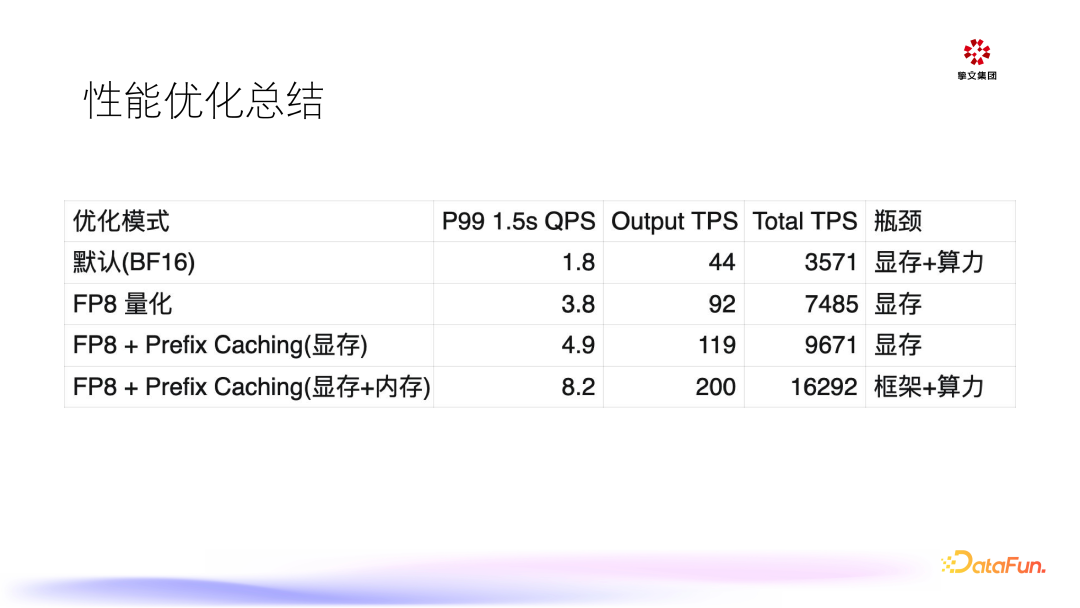 我们做了综合优化评测,限定 P99 耗时在 1.5 秒内,因线上应用是 AI 聊天场景,对耗时有较高要求。在这一限制下,用 BF16 时,QPS 仅 1.8,TPS 为 44,当时用的是 Qwen2 7B 模型,显存算力等方面都存在瓶颈。采用 Smooth Quant 的 W8A8,基于 FP8 量化,吞吐提升了一倍。直接开启基于显存的 Prefix Caching,吞吐会有一定提升,这时显存成为瓶颈。再开启内存后,吞吐有大幅提升,而压力则转移到框架层,算力也达到了瓶颈。