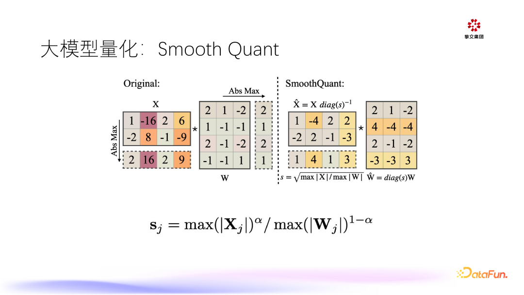 在机器学习模型中,很多时候就是做矩阵乘法,它包含权重和激活值两部分。权重的分布通常比较均匀,坡度也很少;而激活值会有明显峰值,这些峰值对应的数一般叫离群值。以往的量化大多只对权重做量化,在进行矩阵乘法前,都得先转成比如 float32,最终矩阵乘法还是用 float32 去算。