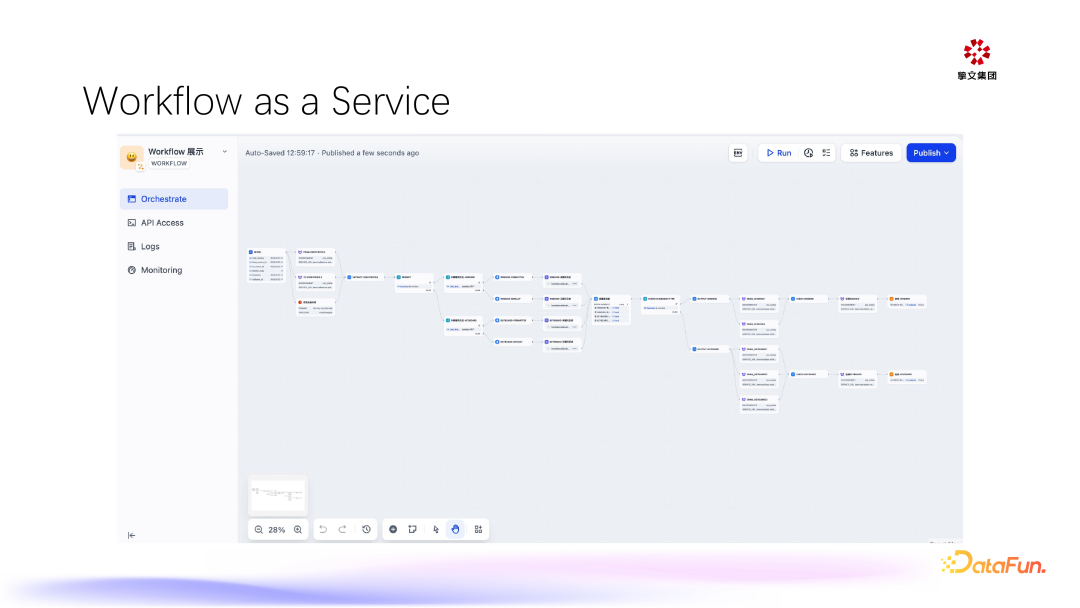 从实践情况来看,我们有一个创新应用,算法同学借助这个平台的 workflow,在一个月内就迭代了 40 个版本。如果这 40 个版本依靠工程师去开发,仅需求沟通恐怕就得花费半个月时间。所以,这种模式对效率提升效果是非常显著的,只要了解大模型且有想法就能快速将想法付诸实践。