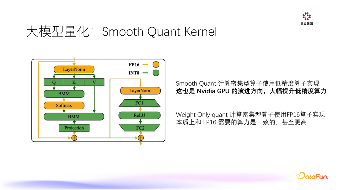 这种量化方案在实现时,矩阵乘法可直接用 int8 进行,不用转成 int16 或 int32 来运算,能大幅提升算力,这也是英伟达 GPU 近年的演进方向。Weight Only Quant 计算密集型算子使用 FP16 算子实现本质上和 FP16 需要的算力是一致的,甚至更高。