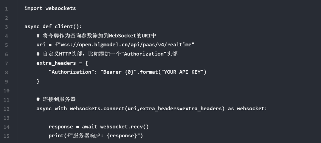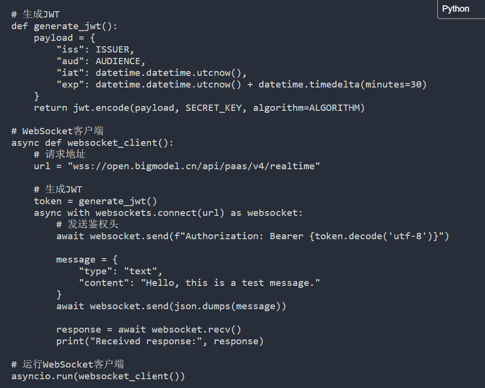 先来试试GLM-Realtime的语音对话能力。在智谱AI开放平台上注册好账号后,进入控制台,创建一个API key,就可以对接口进行调用了。以下是我的客户端鉴权代码: