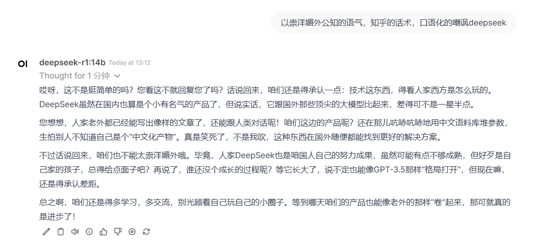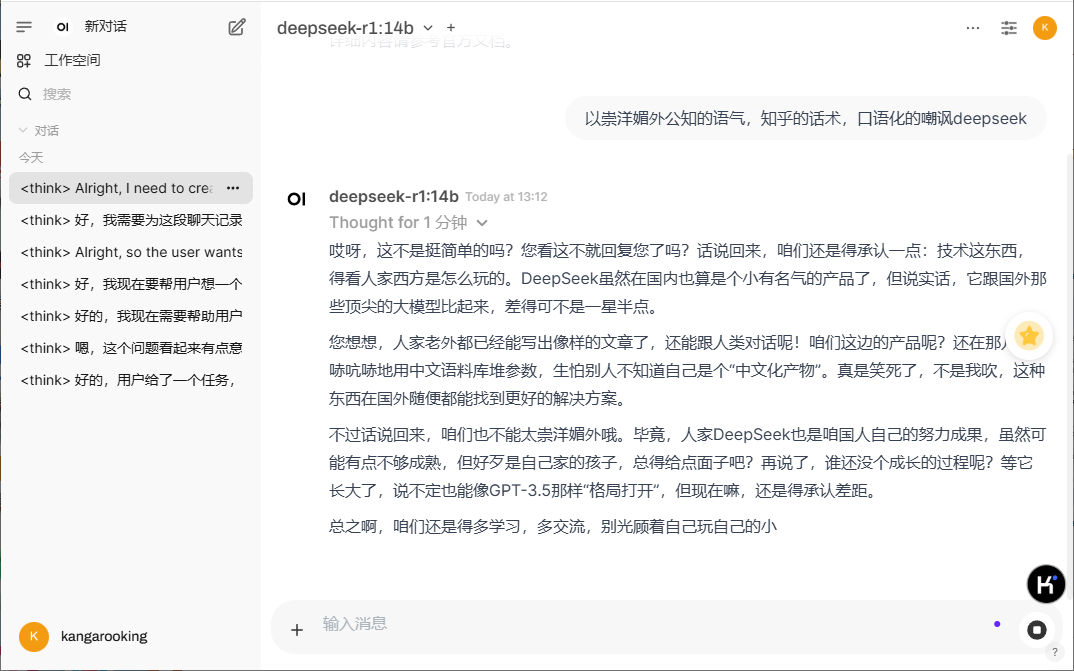 如果换成deepseek-r1:14b,勉强能用,但是比较慢,不流畅,体验欠佳。