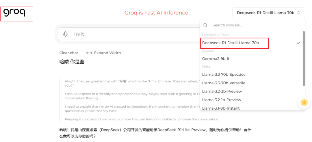 最后Groq这个平台上了deepseek-r1:70b,也是免费用,如果deepseek官网太拥堵,也可以去Groq体验低一档的r1:70b