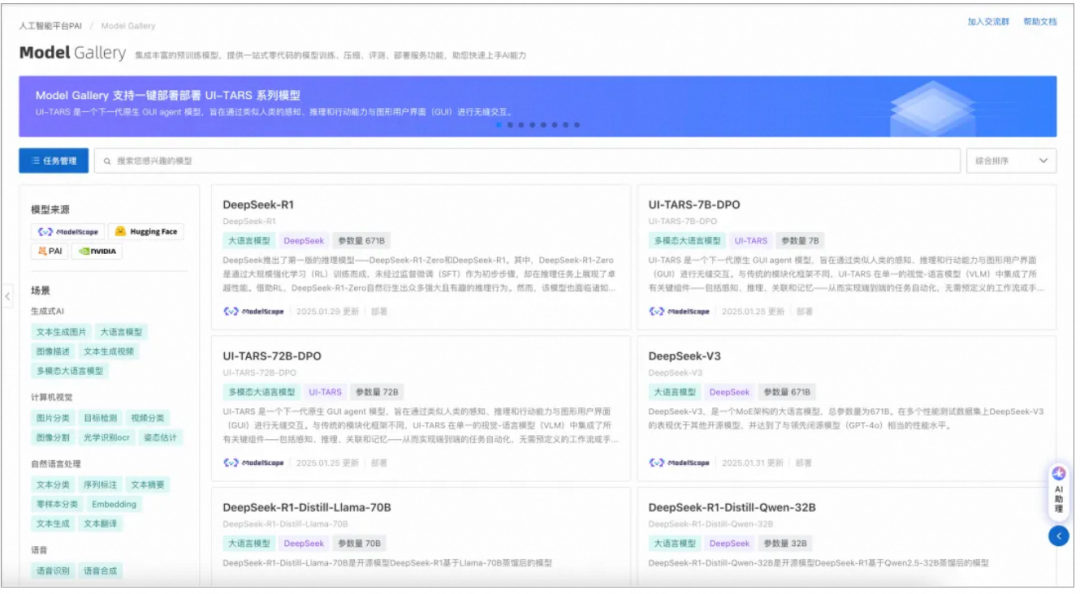 在Model Gallery页面的模型列表中,单击找到并点击需要部署的模型卡片,例如“DeepSeek-R1-Distill-Qwen-7B”模型,进入模型详情页面。