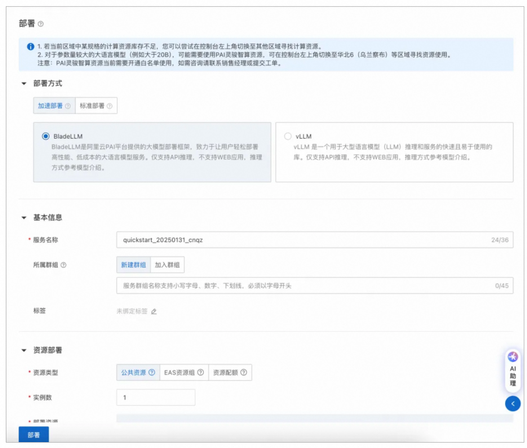 单击右上角部署:目前DeepSeek-R1支持采用vLLM加速部署;DeepSeek-V3 支持vLLM加速部署以及Web应用部署;DeepSeek-R1蒸馏小模型支持采用BladeLLM(阿里云PAI自研高性能推理框架)和vLLM加速部署。选择部署方式和部署资源后,即可一键部署服务,生成一个PAI-EAS服务。