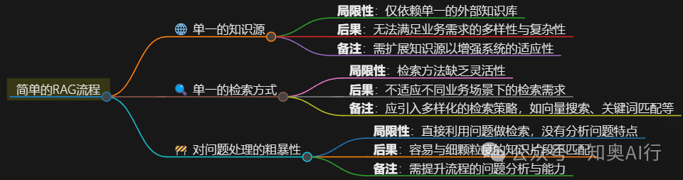 - 对问题处理粗暴:由于只具备单一的知识源及检索方式,自然也缺乏对问题做深入分析的能力。
