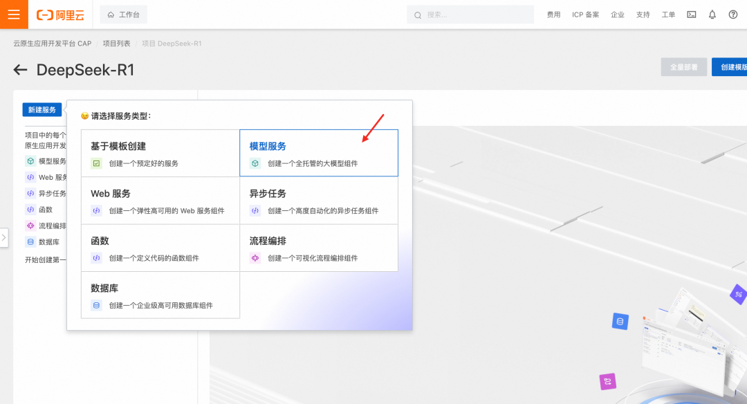 您可以自主切换至 deepseek-ai/DeepSeek-R1-Distill-Qwen-1.5B/14B/32B 或其他参数模型。 同时,Cap 模型部署也支持多种模型部署能力,您可根据业务自行配置相关信息。 实现 DeepSeek-R1 模型 + OpenWebUI 部署。1.创建项目https://cap.console.aliyun.com/projects
