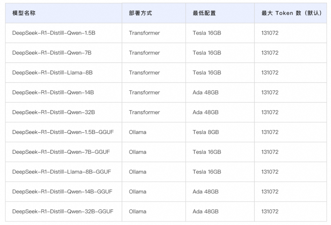如模型来源选择“ModelScope” ,点击“获取 ModelScope 支持模型列表”[4]。 以 DeepSeek-R1-Distill-Qwen-7B-GGUF 为例,模版参考信息: ModelScope ID:lmstudio-community/DeepSeek-R1-Distill-Qwen-7B-GGUF 执行框架:Ollama 模型加载方式:单文件加载 GGUF 文件:DeepSeek-R1-Distill-Qwen-7B-Q4_K_M.gguf  若希望支持列表中没有的更多模型,可至 modelscope 复制相关模型 ID,并修改为加载的 GGUF 文件即可。以DeepSeek 14B[5]为例,如希望部署 14B 模型可将配置改为:ModelScope ID:lmstudio-community/DeepSeek-R1-Distill-Qwen-14B-GGUF GGUF 文件:DeepSeek-R1-Distill-Qwen-14B-Q4_K_M.gguf