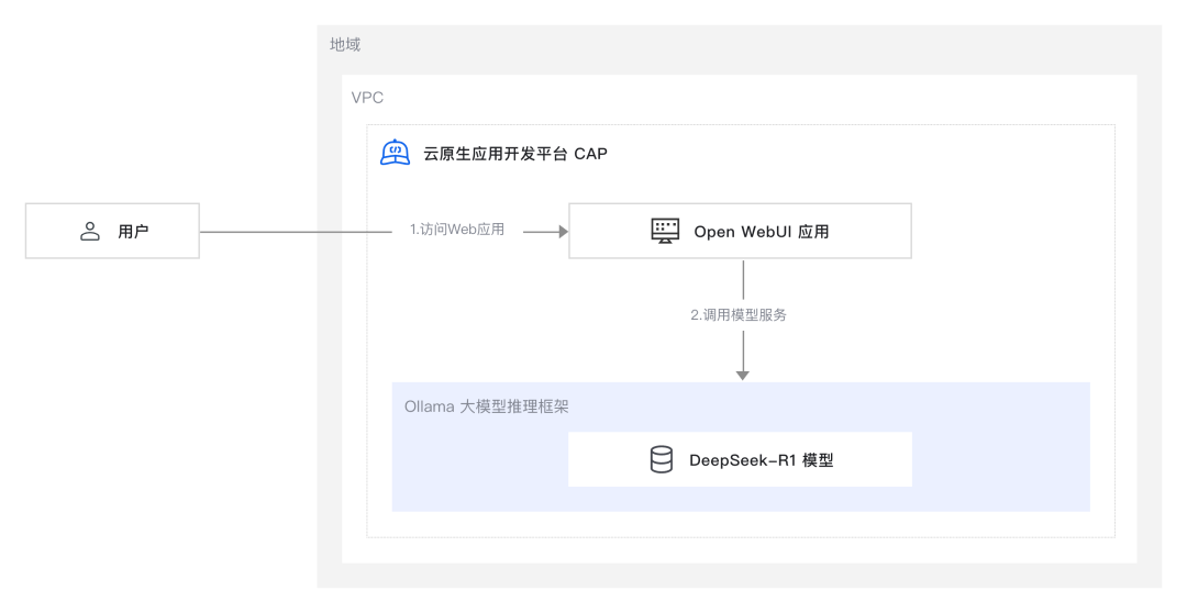 DeepSeek 凭借其卓越的性能和广泛的应用场景,迅速在全球范围内获得了极高的关注度和广泛的用户基础。DeepSeek-R1-Distill 是使用 DeepSeek-R1 生成的样本对开源模型进行蒸馏得到的小模型,拥有更小参数规模,推理成本更低,基准测试同样表现出色。 本方案以 DeepSeek-R1-Distill-Qwen-7B-GGUF 模型为例,介绍如何部署 DeepSeek-R1 开源模型。通过函数计算FC,以及云原生应用开发平台 CAP 的模型服务、应用模版两种部署方式辅助您完成 DeepSeek R1 系列模型的部署。借助 CAP,可以快速便捷地部署模型,而无需担心底层资源管理和运维问题,从而专注于应用的创新和开发。同时该方案提供了免运维的高效开发环境,具备弹性伸缩和高可用性,并采用按量付费模式,有效降低资源闲置成本。完成模型部署后,您即可与模型进行对话体验;或以 API 形式进行调用,接入 AI 应用中。适用于需要一键部署,不关注运维、按量付费的用户,部署难度低,最快 10 分钟,最低 0 元即可完成部署。欢迎点击阅读原文体验部署~ 本文将以 DeepSeek-R1-Distill-Qwen-7B-GGUF 模型演示部署流程。按照本方案提供的配置完成部署后,会在阿里云上搭建一个如下图所示的运行环境。实际部署时,您可根据具体的资源规划调整部分配置,但最终的运行环境将与下图展示的架构相似。