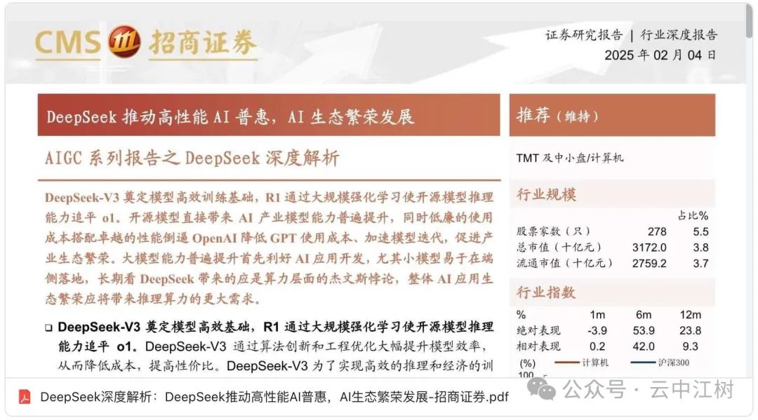 关注「云中江树」公众号,私信「DeepSeek合集」获取  2. DeepSeek深度解析:DeepSeek推动高性能AI普惠,AI生态繁荣发展-招商证券.pdf- https://langgptai.feishu.cn/wiki/MoVfwLaKriBo59kD1ATcpgQEngb