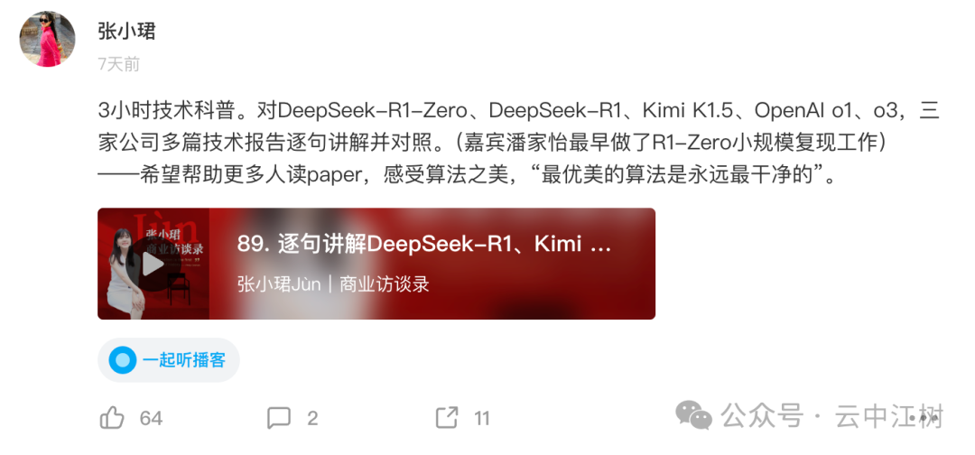 5. 张小珺:对DeepSeek 的论文解读——第一篇对DeepSeek-R1-Zero、DeepSeek-R1、Kimi K1.5、OpenAI o1、o3,三家公司多篇技术报告逐句讲解并对照。 嘉宾潘家怡最早做了R1-Zero小规模复现工作  链接:https://web.okjike.com/originalPost/67a1d2be59e3932f7991e5eb 6. 张小珺:对DeepSeek 的论文解读——第二篇。对DeepSeek LLM、MoE、V2、V3、Coder、Coder-V2、Prover、Prover-V1.5、R1,9篇论文逐篇精读。 嘉宾何俊贤很早就做了类R1工作,从第一篇paper就深度关注ds的系列研究  链接:https://web.okjike.com/originalPost/67ab197154198f7f1660fc6d 7. 海外独角兽关于DeepSeek 的思考原文:对 DeepSeek 和智能下半场的几条判断