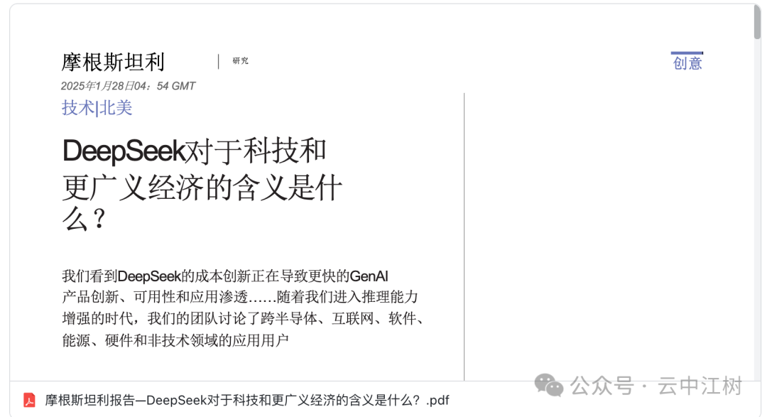 关注「云中江树」公众号,私信「DeepSeek合集」获取  3. 摩根斯坦利报告—DeepSeek对于科技和更广义经济的含义是什么?.pdf- https://langgptai.feishu.cn/wiki/MoVfwLaKriBo59kD1ATcpgQEngb