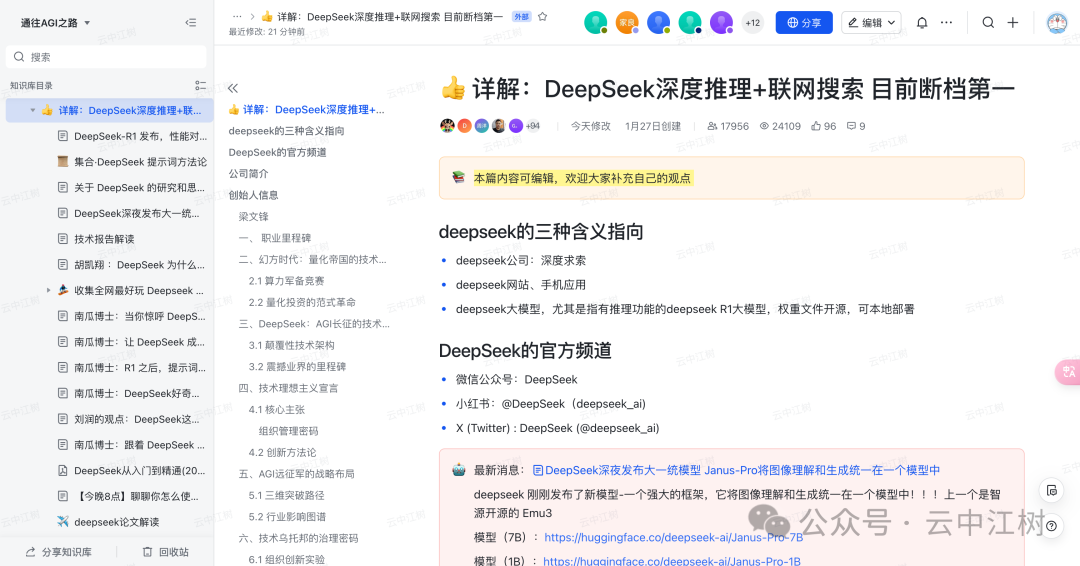 这是一份「通往AGI之路」开源社区整理的 DeepSeek资源合集,强烈推荐 https://waytoagi.feishu.cn/wiki/D9McwUWtQiFh9sksz4ccmn4Dneg