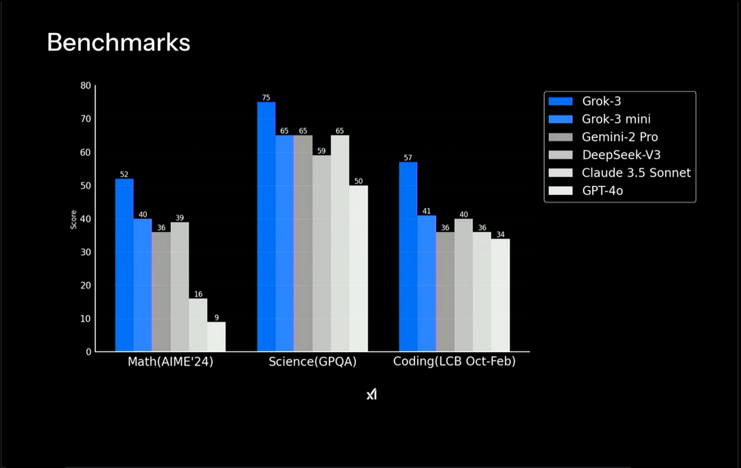 再来从图表上分析一下Grok3的具体性能,有没有水分: