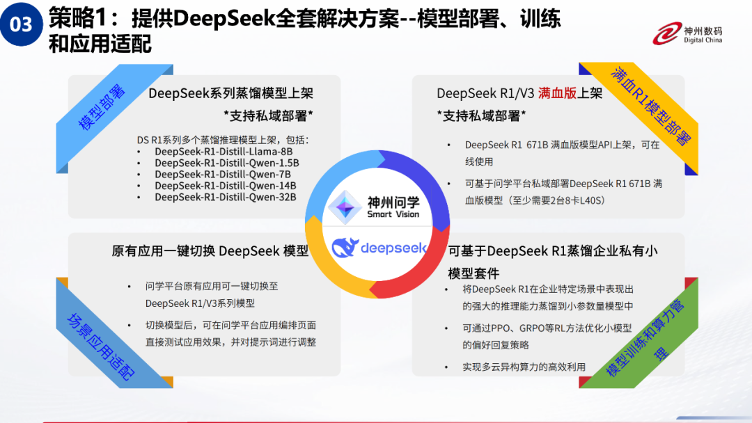 策略 1:提供 DeepSeek 全套解决方案 -- 模型部署、训练和应用适配 以我们公司过往的经验为例,首先,作为一家专注于 AI 技术落地应用的公司,神州数码的第一个策略是为行业提供完整的 DeepSeek 解决方案。这包括模型的部署,无论是满血版还是各种尺寸的蒸馏版,以及模型训练和算力管理。例如,基于千问 32B 这种主流模型,我们现有的平台产品不仅能支持模型训练,还能实现多元异构算力的高效利用和管理,从而提升算力的使用效率。同时,我们的平台还集成了智能体和知识管理模块,以支持企业场景的应用和适配。我们认为,这个过程不是一个单向的,而是一个不断迭代的循环。通过模型的部署、训练和应用适配,我们不断循环优化,持续抽取企业行业中的最佳实践案例,从而为客户提供更优质的解决方案。