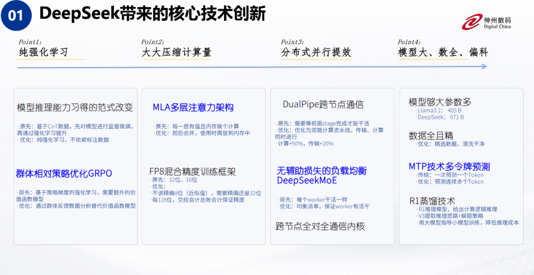 企业流程重塑与再造:DeepSeek R1 的成功及开源,改变了市场竞争的格局和态势,将来也会催生新的商业模式。比如围绕开源生态、高效推理、模型蒸馏等模型架构创新、 核心关键技术展开新的商业范式。
