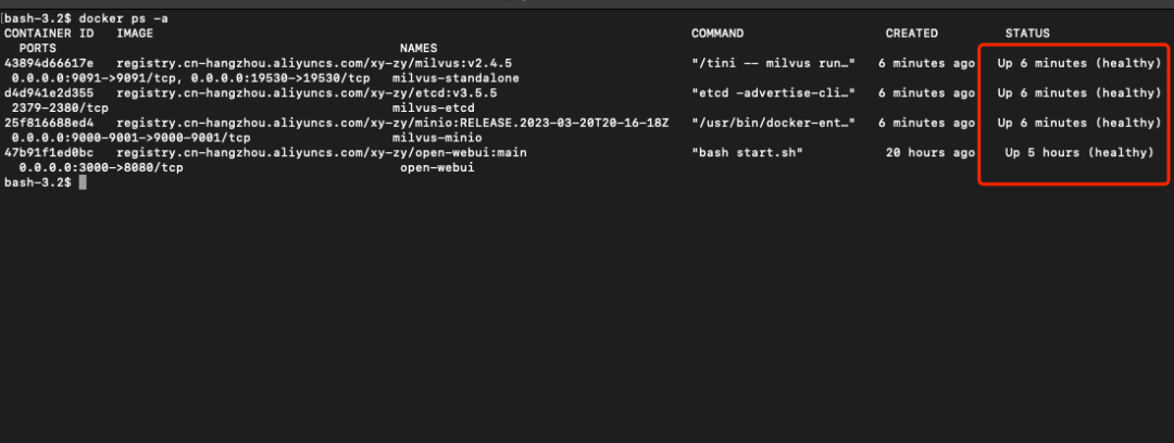 1.2修改配置文件 说明:anythingllm对接milvus时需要提供milvus账号密码,因此需要修改docker-compose.yml文件中的username和password字段。 version:'3.5'services:etcd:container_name:milvus-etcdimage:registry.cn-hangzhou.aliyuncs.com/xy-zy/etcd:v3.5.5environment:-ETCD_AUTO_COMPACTION_MODE=revision-ETCD_AUTO_COMPACTION_RETENTION=1000-ETCD_QUOTA_BACKEND_BYTES=4294967296-ETCD_SNAPSHOT_COUNT=50000volumes:-${DOCKER_VOLUME_DIRECTORY:-.}/volumes/etcd:/etcdcommand:etcd-advertise-client-urls=http://127.0.0.1:2379-listen-client-urlshttp://0.0.0.0:2379--data-dir/etcdhealthcheck:test:["CMD","etcdctl","endpoint","health"]interval:30stimeout:20sretries:3minio:container_name:milvus-minioimage:registry.cn-hangzhou.aliyuncs.com/xy-zy/minio:RELEASE.2023-03-20T20-16-18Zenvironment:MINIO_ACCESS_KEY:minioadminMINIO_SECRET_KEY:minioadminports:-"9001:9001"-"9000:9000"volumes:-${DOCKER_VOLUME_DIRECTORY:-.}/volumes/minio:/minio_datacommand:minioserver/minio_data--console-address":9001"healthcheck:test:["CMD","curl","-f","http://localhost:9000/minio/health/live"]interval:30stimeout:20sretries:3standalone:container_name:milvus-standaloneimage:registry.cn-hangzhou.aliyuncs.com/xy-zy/milvus:v2.5.4command:["milvus","run","standalone"]security_opt:-seccomp:unconfinedenvironment:ETCD_ENDPOINTS:etcd:2379MINIO_ADDRESS:minio:9000COMMON_USER:milvusCOMMON_PASSWORD:milvusvolumes:-${DOCKER_VOLUME_DIRECTORY:-.}/volumes/milvus:/var/lib/milvushealthcheck:test:["CMD","curl","-f","http://localhost:9091/healthz"]interval:30sstart_period:90stimeout:20sretries:3ports:-"19530:19530"-"9091:9091"depends_on:-"etcd"-"minio"networks:default:name:milvus1.3启动并检查Milvus服务bash-3.2$docker-composeup-d