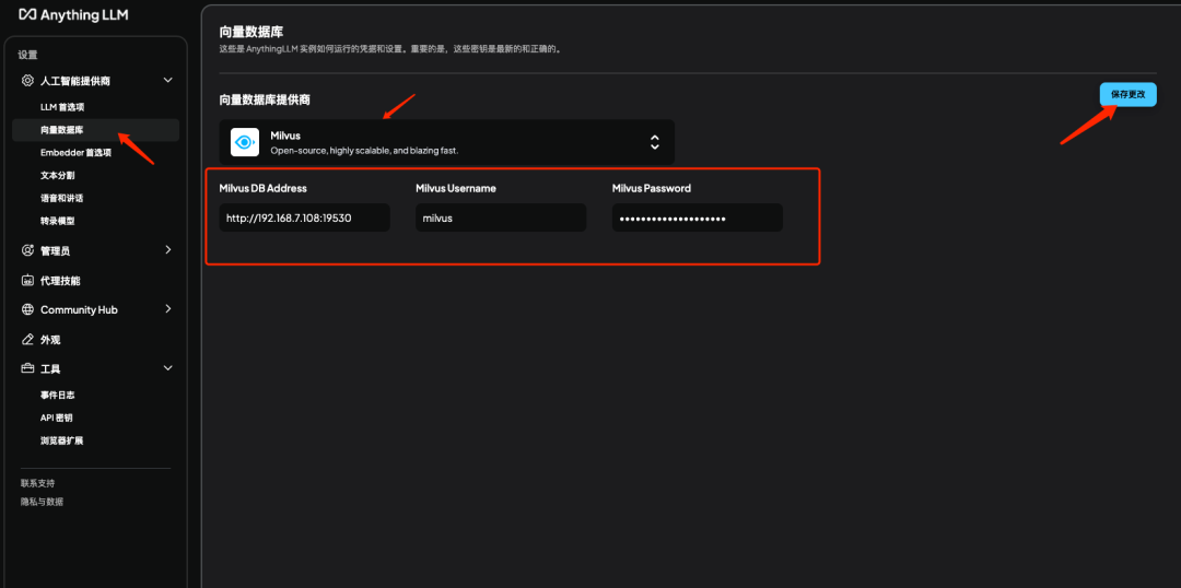 5.2 添加milvus向量数据库说明:点击向量数据库选项选择Milvus并填入刚才部署好的milvus的地址、用户名、密码并保存