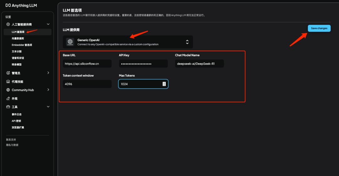(5)配置AnythingLLM5.1添加deepseek模型说明:点击LLM首选项选择提供商Generic OpenAI并填入刚才注册的API密钥、baserul、deepseek模型名称并保存