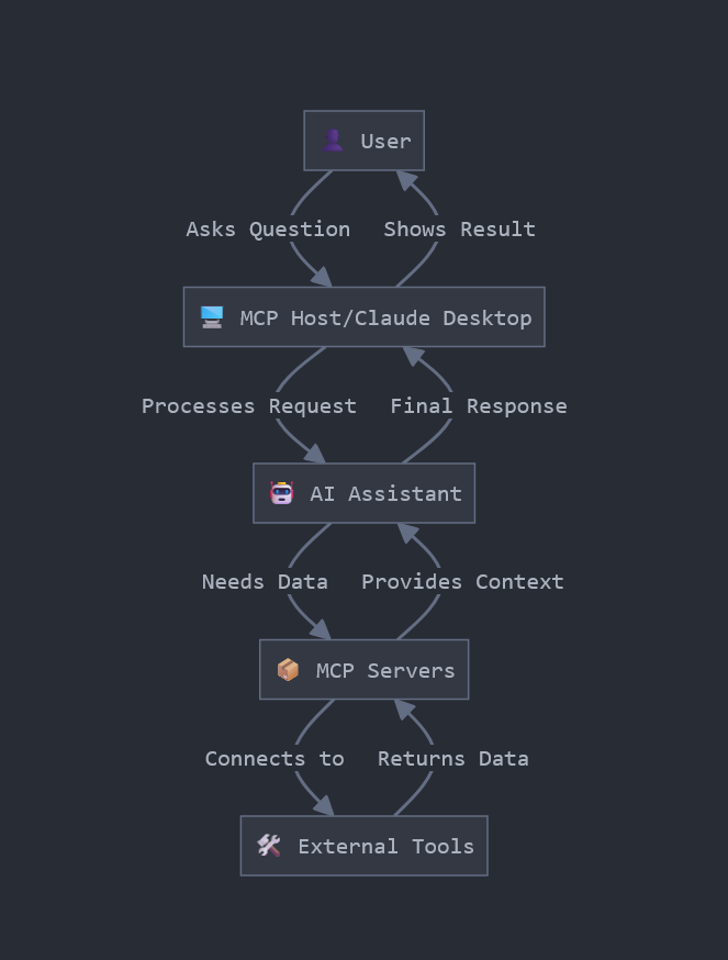 先简单了解下MCP的工作原理,MCP就像你和AI助手之间的智能翻译。你在Claude桌面应用(MCP主机)提问,AI思考后,若需要更多信息,就会找特定的MCP服务器获取,最后把答案给你。