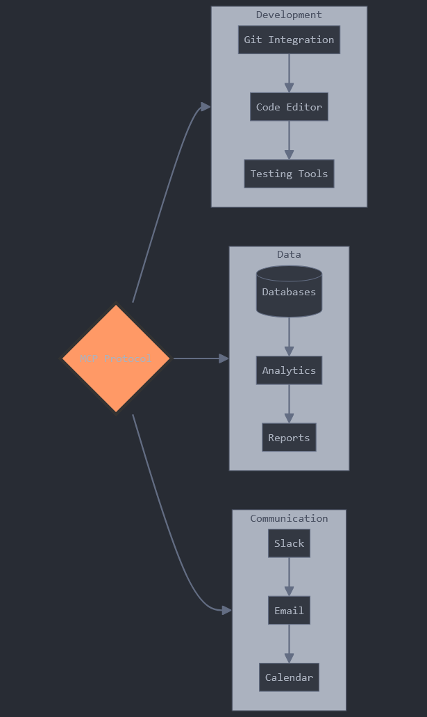 MCP 带来的惊喜不止于此。通过 MCP,各类工具实现了互联互通。开发工具(如 Git 与代码编辑器)协同运作,数据工具(数据库和分析工具)实时共享信息,就连通信工具(Slack、电子邮件)也融入其中。原本各自为战的应用程序,在 MCP 的 “撮合” 下,紧密协作,共同为用户提供更高效、更智能的服务体验。