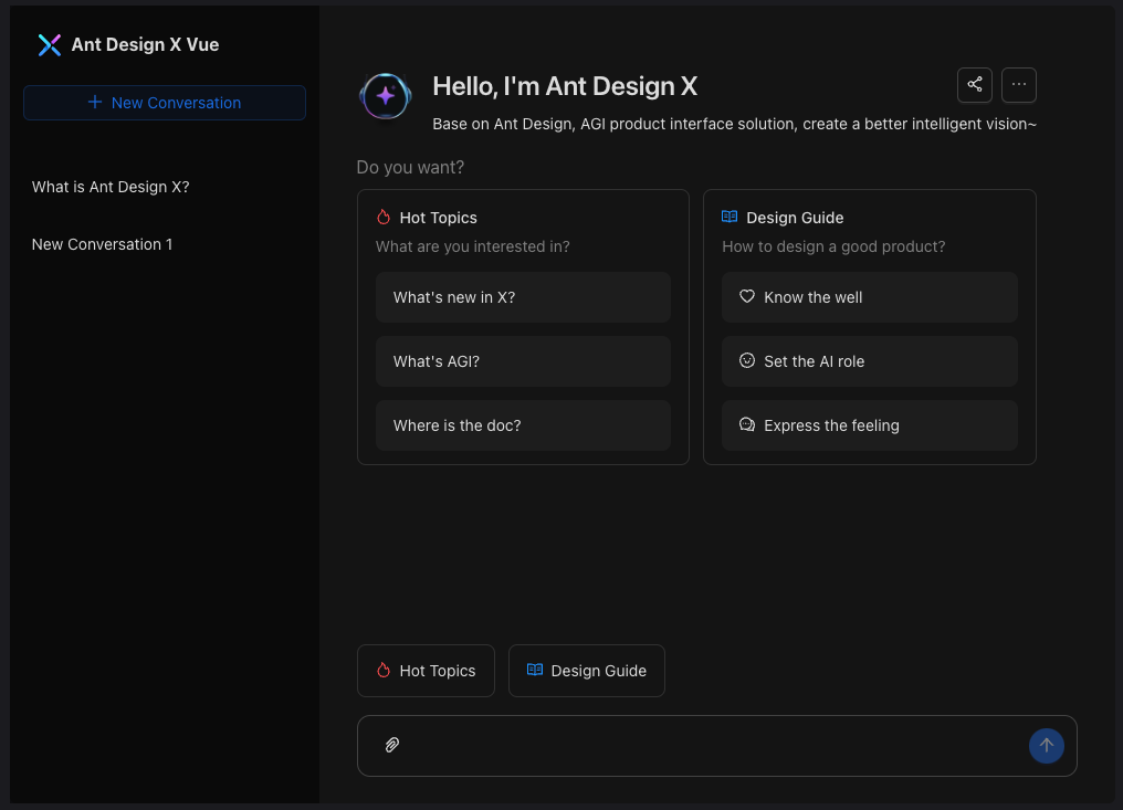 访问Ant Design X Vue官方文档:https://antd-design-x-vue.netlify.app/获取更多信息。 Ant Design X Vue为 Vue 开发者提供了强大的 AI 组件库,助力高效构建智能应用。 无论是聊天应用还是企业级系统,都值得一试。