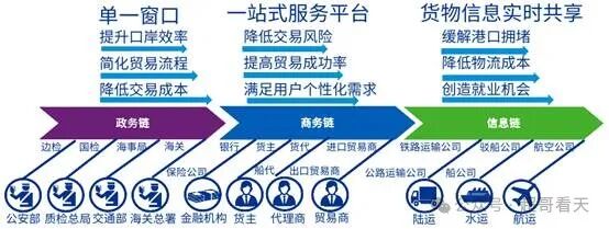 会以三种不同形式的链条全面打通港口上下游产业链。它们分别是政务流、信息流以及商务流。其中政务流将高效打通海关、海事、国检等口岸部门,提高政务文件处理效率。信息流作为连接港口与海陆空三种运输企业的桥梁可以减少港口与航运、海运、陆运衔接过程中的信息不对称和效率低下,提升信息共享与透明度。商务流则是从贸易、金融、货物三个方面串联贸易商、货代、货主以及金融机构,通过共享信息,降低金融风险,增加商务订单。