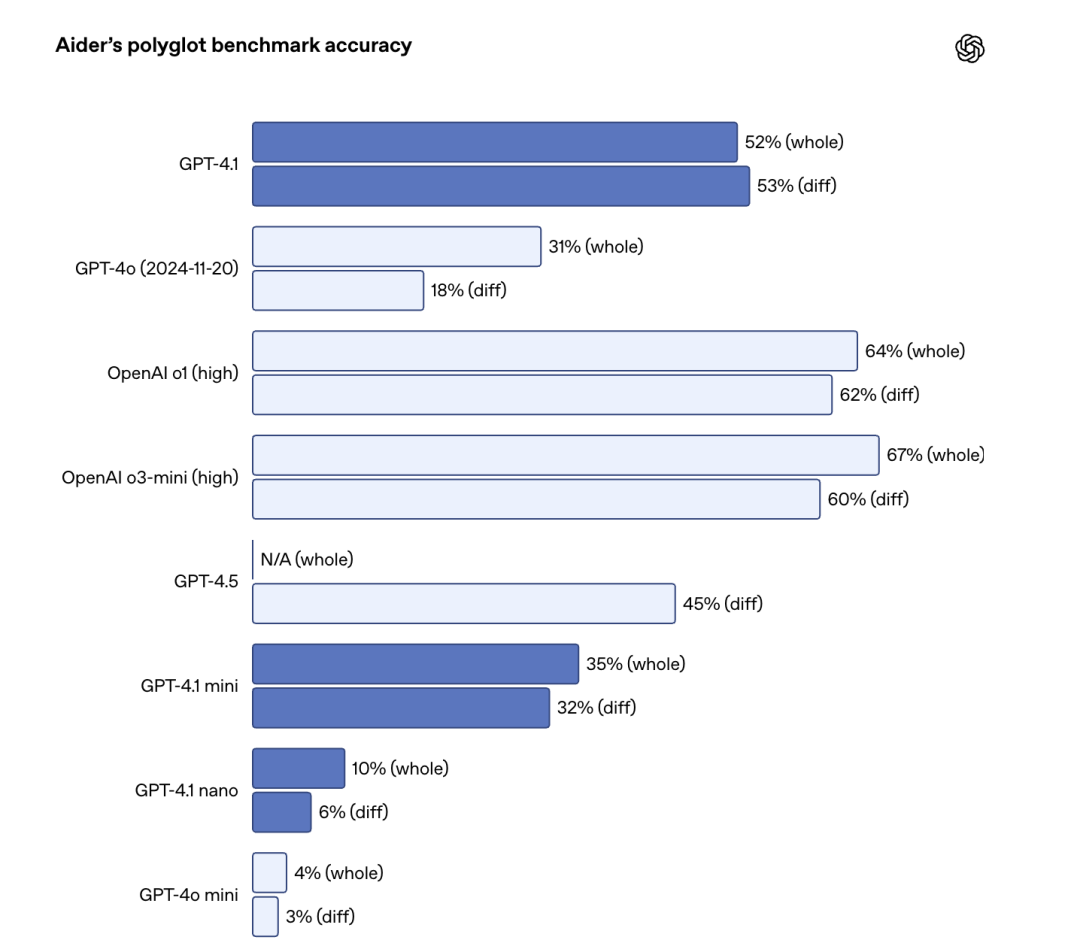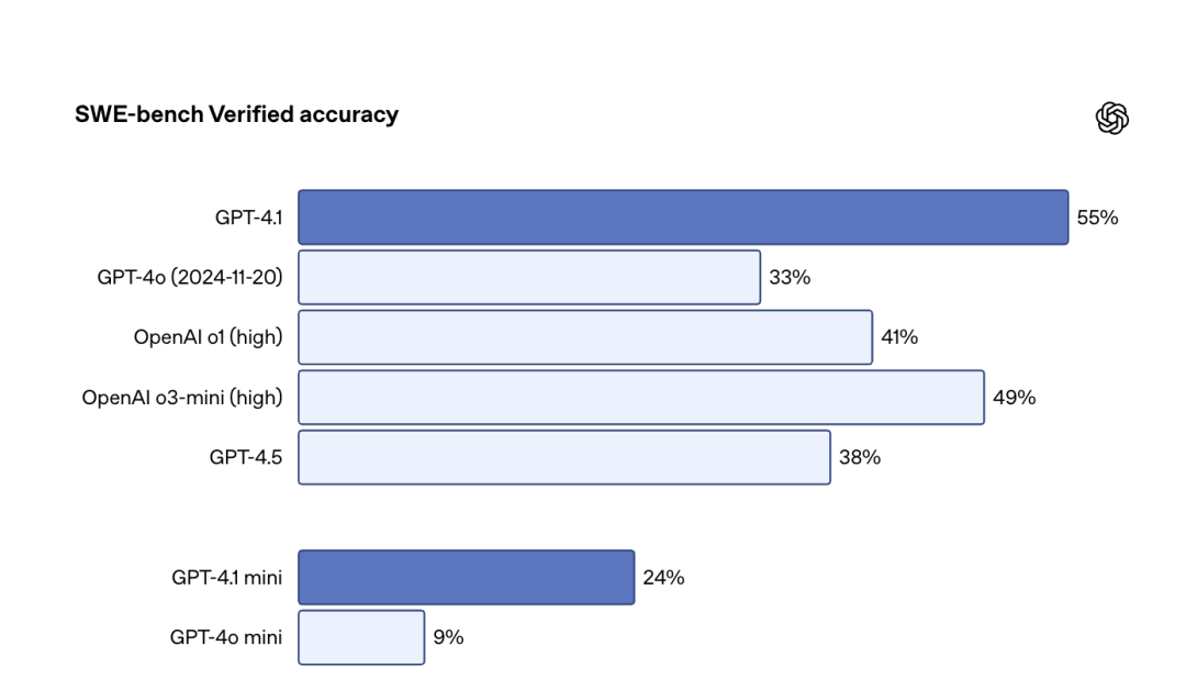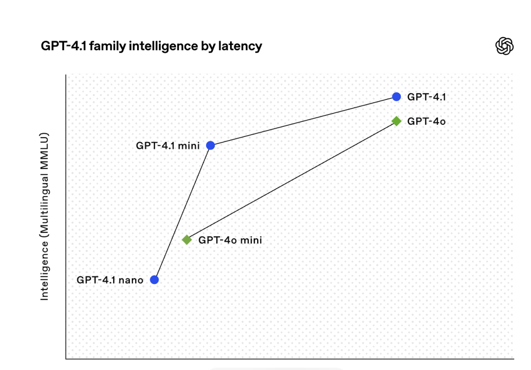 性能提升与效率并重:GPT-4.1 mini将延迟时间减少了近一半,成本比GPT-4o降低了83%。尽管体积更小,它在速度和质量方面经常超越GPT-4o。