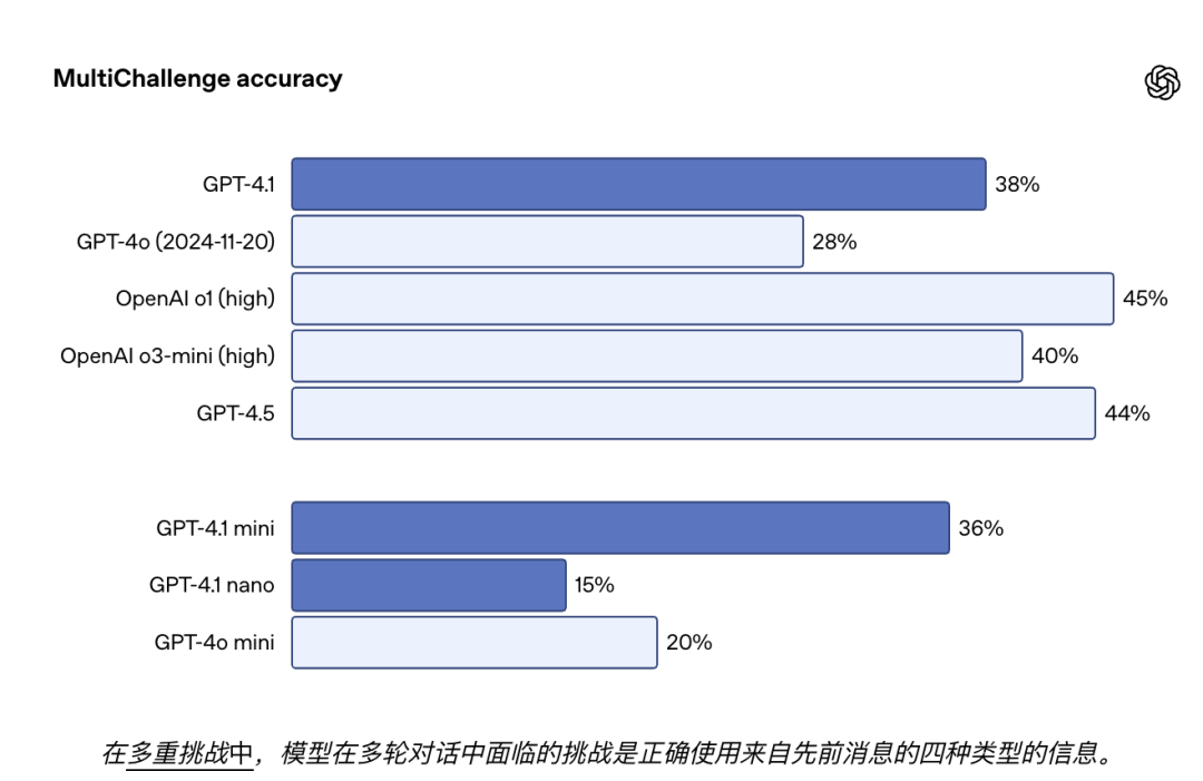 多轮指令遵循对许多开发者来说至关重要——对于模型而言,在对话中保持连贯性并跟踪用户之前输入的内容至关重要。我们已经训练了 GPT-4.1,使其能够更好地从对话中的过往消息中识别信息,从而实现更自然的对话。Scale 的 MultiChallenge 基准测试是衡量这一能力的有效指标,GPT-4.1 的表现比GPT-4o 提高了 10.5%。