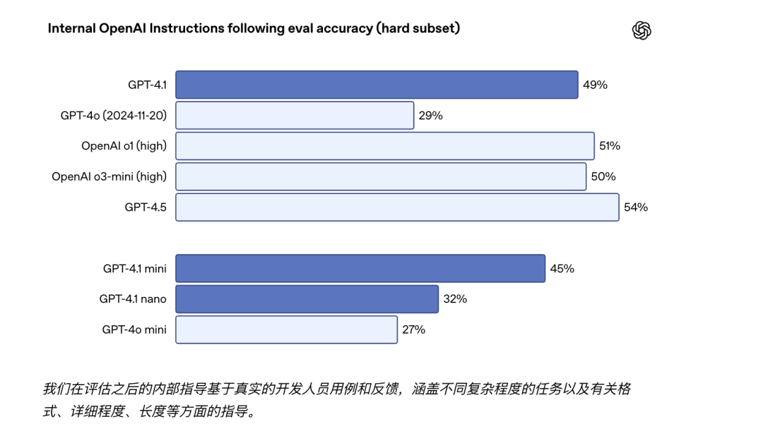 GPT-4.1 更可靠地遵循指令,并且我们已经在各种指令遵循评估中测量到了显著的改进。