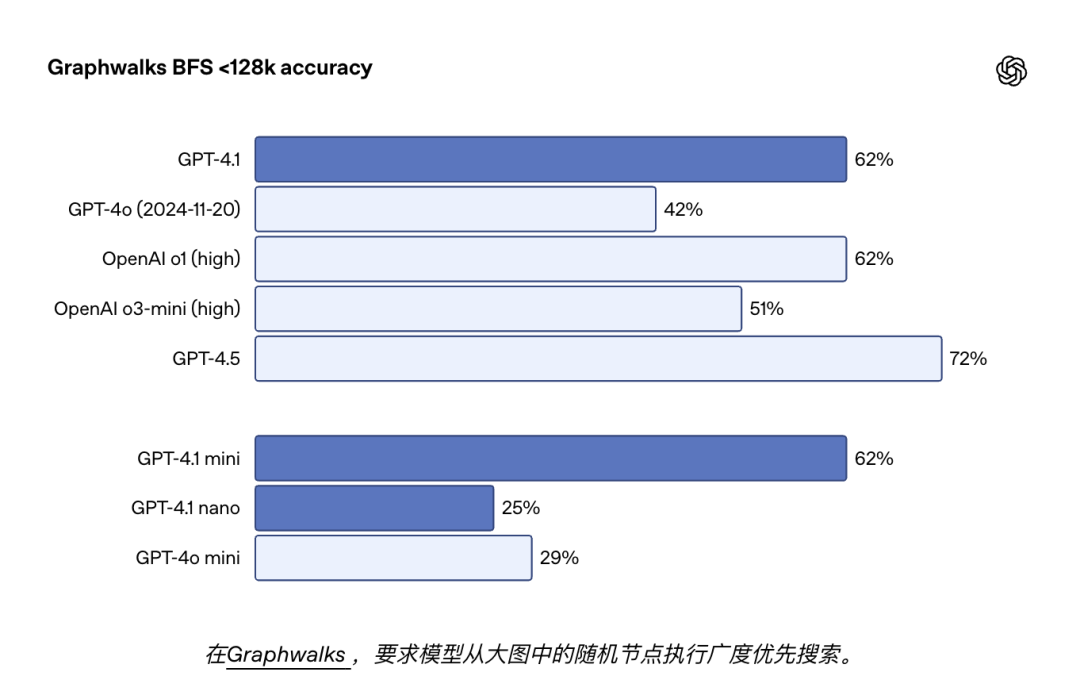 Graphwalks 使用由十六进制哈希值组成的有向图填充上下文窗口,然后要求模型从图中的随机节点开始执行广度优先搜索 (BFS)。然后,我们要求它返回特定深度的所有节点。GPT-4.1 在此基准测试中达到了 61.7% 的准确率,与 o1 的性能相当,并轻松击败了 GPT-4o。