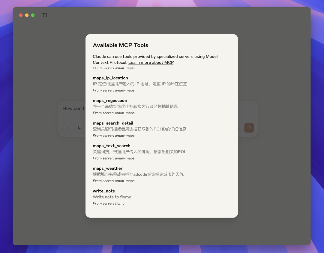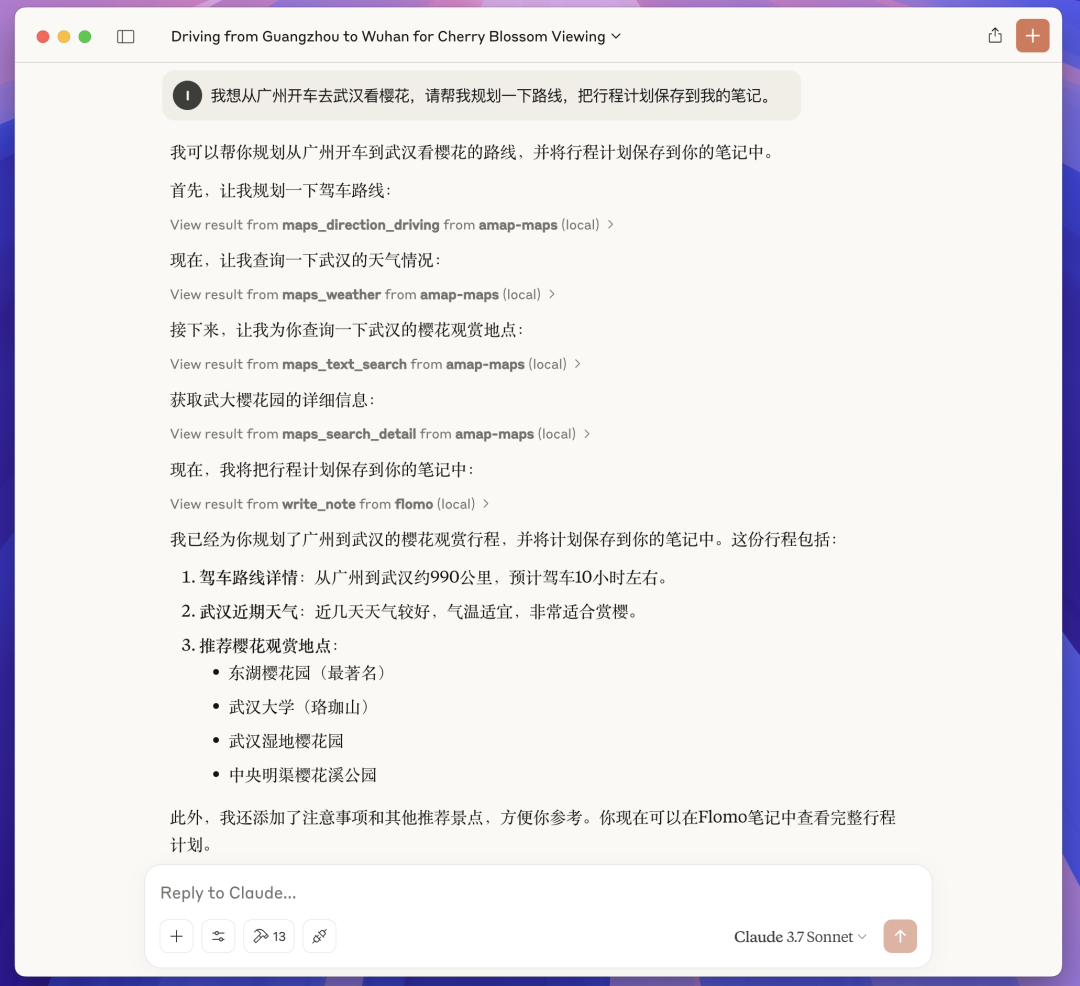Claude 开始处理,在响应过程中调用了amap-maps服务器提供的四个工具,查询位置和天气信息,最后调用flomo服务器的write_note工具,把行程计划保存到了浮墨笔记。