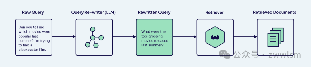 查询改写是指将用户的原始查询进行重新表述,使其更加适合向量检索或关键词检索的需要。当用户查询过于口语化、含糊不清或措辞不当时,改写可以澄清意图、补充必要细节并采用与知识库内容更匹配的表述 。一种常用做法是利用一个语言模型(可以是一个小型专用模型或直接调用LLM)将原查询换一种说法:保持原意不变但使用更正式、明确的措辞 。例如,将“帮我找一下去年夏天最火的电影”改写为“2024年夏季上映的票房最高的几部电影有哪些?”这样包含了更明确的时间范围和评价标准。改写后的查询更接近知识库中内容的表述,有助于检索到相关文档。实际上,通过先改写再检索再生成回答的流程,被称为重写-检索-生成(Rewrite-Retrieve-Read)管道,相对于直接“检索-生成”可以显著提高检索质量。