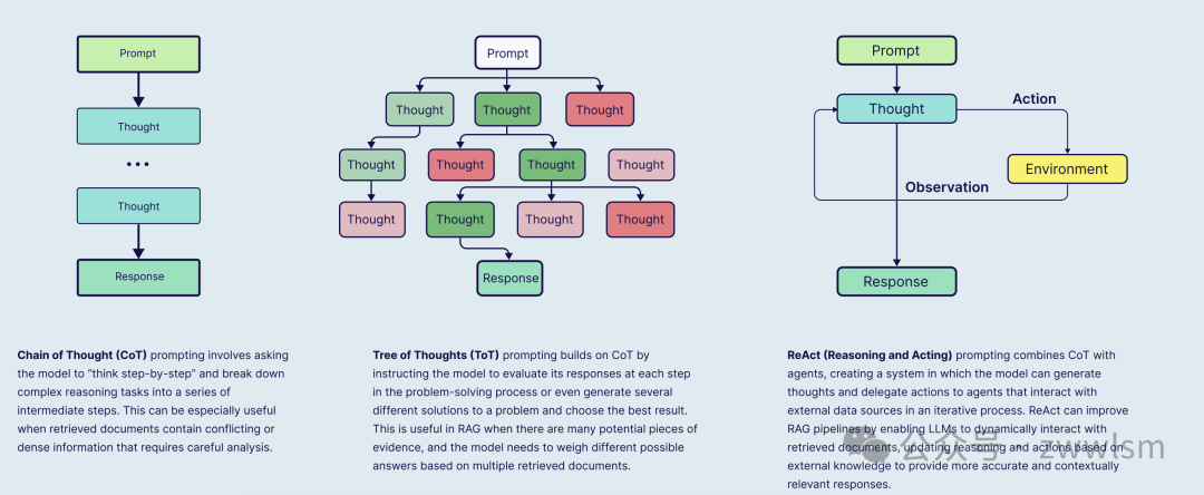 • ReAct 提示(Reason + Act):ReAct是将推理(Reasoning)与动作(Acting)交替结合的一种提示策略。具体来说,模型在思考过程中可以被指示去执行某些操作(比如再次检索、调用计算工具等),然后依据新获得的结果继续推理。这种方法实际上让模型变成了一个有决策能力的agent,它能边查边想。一轮典型的ReAct交互可能是:模型先输出思考:“根据已有内容还不确定答案,我需要查找X”,然后输出动作:“搜索X”;得到新信息后再输出下一步思考,直至形成最终答案。通过ReAct提示,LLM可以动态地与外部知识交互,不断修正和丰富自己的答案。这对于复杂问题(尤其是需要多步检索的)能大大提高答案的精准性和依据性。