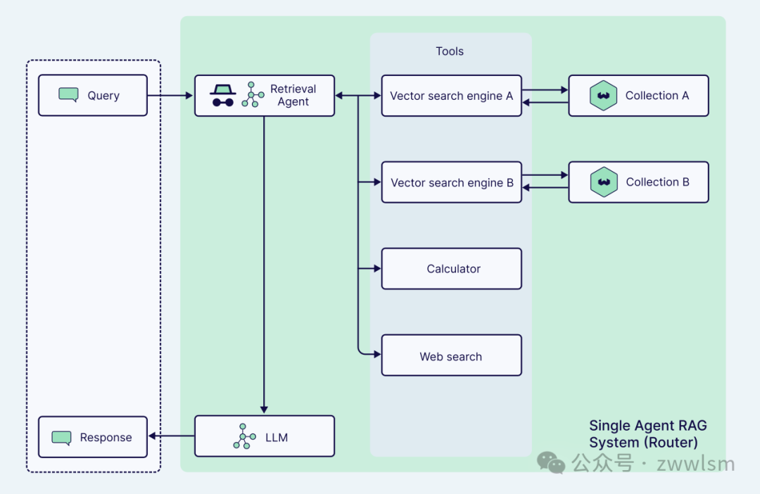 一种高级形式的查询路由是引入智能代理(Agent)的RAG架构。代理模型会先对用户查询进行分析,判断其所属领域、复杂程度以及需要的工具,然后选择相应的方案处理。例如,对于一个纯事实型的问题,代理可能将其路由到使用百科知识库的管线;而若问题需要计算或最新资讯,代理则调用计算器或网络搜索等工具。在这种代理架构下,RAG系统仿佛由多个专家代理组成的网络,每个代理专长不同:有的擅长数据库查询,有的擅长调用API,还有的专注文本总结 。代理通过推理和调度来决定采用关键词检索、语义检索还是混合检索,是否需要改写查询或使用特殊工具来得到答案。总之,查询路由使RAG系统具备了根据提问灵活调整检索策略的能力,在应对多样化查询时更加高效且准确