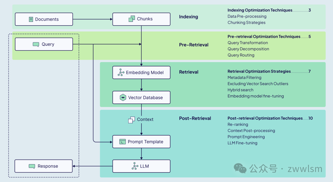 为了提升RAG系统的回答质量,我们需要在上述流程的各个环节应用更高级的优化技术。例如,可以优化知识库的构建方式、改写用户的查询、改进检索算法,或者在检索后对结果进行后处理等。接下来,我们将分阶段介绍RAG的优化方法,包括索引阶段的优化检索前优化检索阶段优化检索后优化,并通过实例讲解每种技术如何提高RAG的性能。