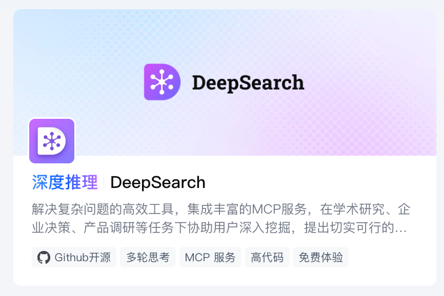 MCP 工具支持也是作为 DeepSearch 的亮点之一重点介绍。