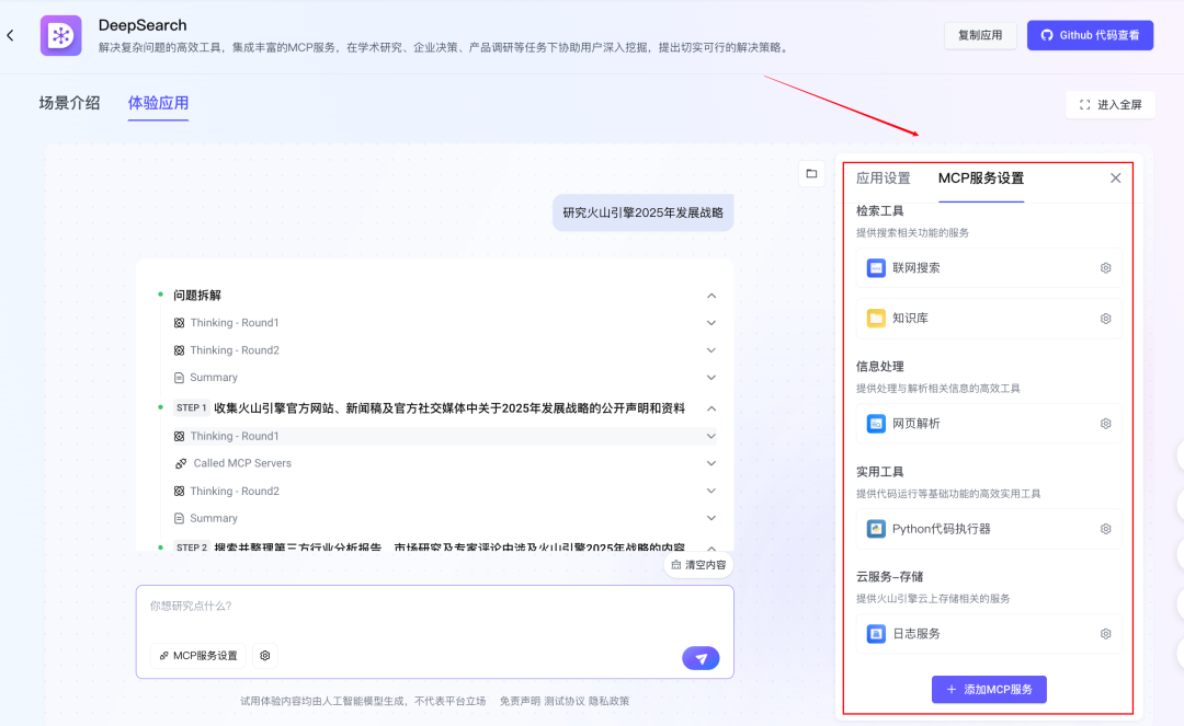 链接在这里: https://github.com/volcengine/ai-app-lab/tree/main/demohouse/deep_search_mcp/backend