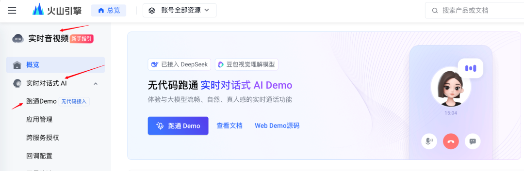 这次火山引擎推出了实时音视频的能力,还推出了「无代码跑通 实时对话式 AI Demo」方便开发者体验整个 AI 实时能力。