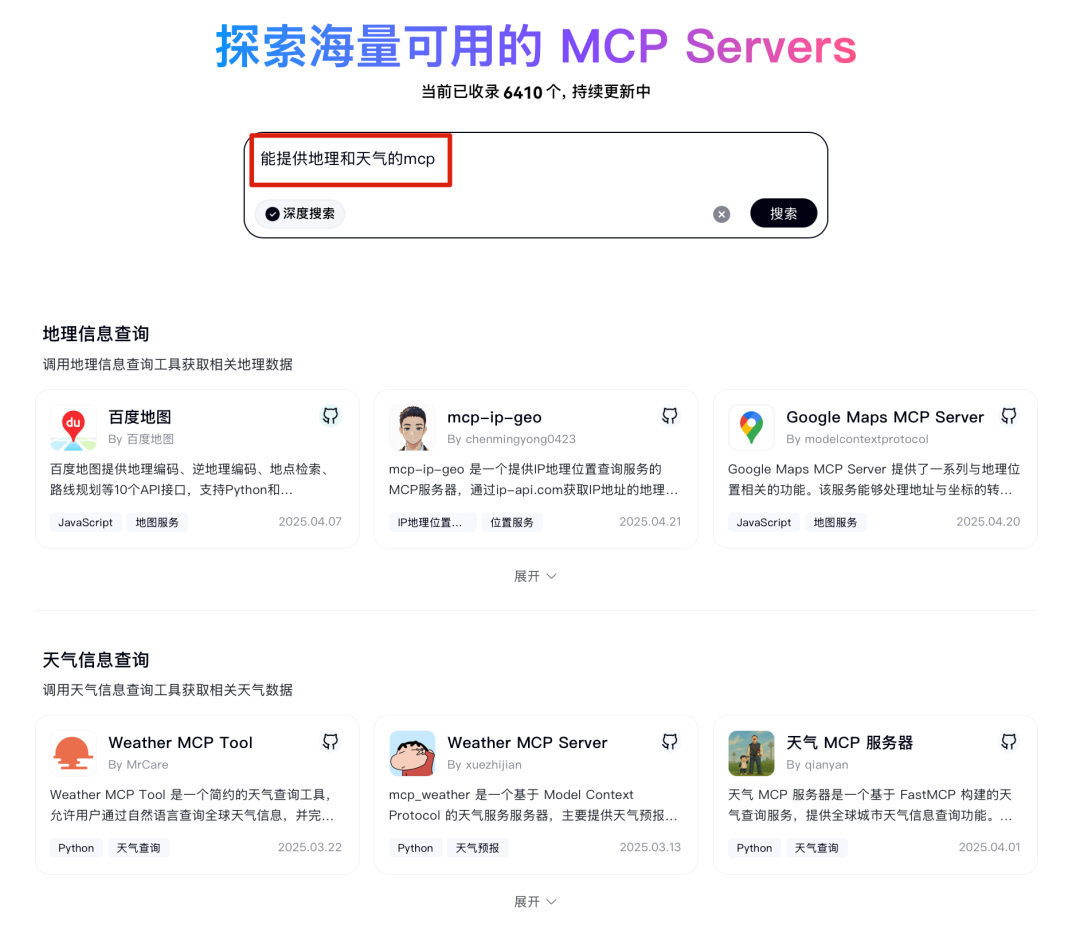 搜索框支持深度搜索,可以同时搜索出满足多个能力的多个 MCP Servers,这里我就搜索出了能看地理位置和天气情况的多个结果。