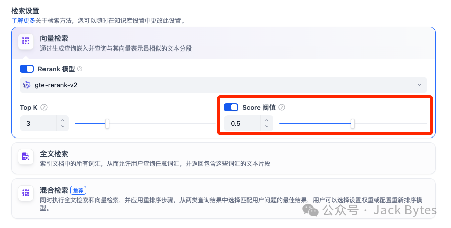 在使用「向量检索」或者「混合检索」的时候,如果召回结果中包含了一些低质量的结果,那么很有可能会影响大模型的判断,因此,可以通过设置分数阈值把低质量的结果丢弃掉。