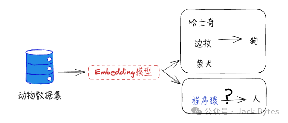 举个例子,假如一个Embedding模型只在动物数据集上进行了训练,它虽然能够识别出来「哈士奇」、「边牧」、「柴犬」都是狗,但是却不一定能够识别出来「程序猿」是人。