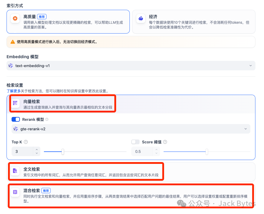 其中「高质量」索引方式同时包含了:向量检索、全文检索、混合检索。