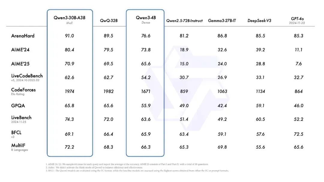 本次Qwen3开源了两个 MoE 模型的权重:Qwen3-235B-A22B,一个拥有 2350 多亿总参数和 220 多亿激活参数的大模型,以及Qwen3-30B-A3B,一个拥有约 300 亿总参数和 30 亿激活参数的小型 MoE 模型。此外,六个 Dense 模型也已开源,包括 Qwen3-32B、Qwen3-14B、Qwen3-8B、Qwen3-4B、Qwen3-1.7B 和 Qwen3-0.6B,均在 Apache 2.0 许可下开源。