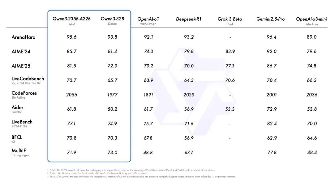 其中,旗舰模型Qwen3-235B-A22B在代码、数学、通用能力等基准测试中,与 DeepSeek-R1、o1、o3-mini、Grok-3 和 Gemini-2.5-Pro 等顶级模型相比,表现出极具竞争力的结果。此外,小型 MoE 模型 Qwen3-30B-A3B 的激活参数数量是 QwQ-32B 的 10%,表现更胜一筹,甚至像 Qwen3-4B 这样的小模型也能匹敌 Qwen2.5-72B-Instruct 的性能。
