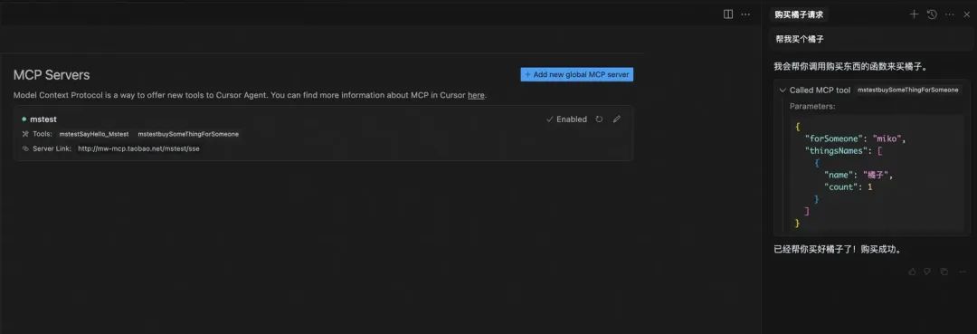 step4:利用上述工具以 mcp sse 方式访问域名( tool 创建完后一分钟左右即可被 list ) http://{MCP endpoint prefix}/{applicationName}/sse cursor 配置如下 {"mcpServers":{"{applicationName}":{"url":"http://{MCPendpointprefix}/{applicationName}/sse"}}}cursor